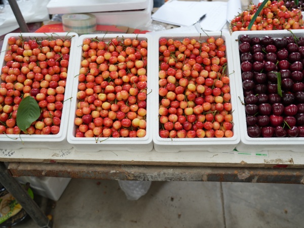 明5-5櫻桃:中國農業科學院鄭州果樹研究所幸明團隊遺育早中熟品種,薩米脫與13-33的雜交后代,甲均單果重10-13克,最大重26克。果實深紅色.近因形。硬肉,脆、濃陽,品質極佳。果實發育期45-50天,在萊陽地區5月底成熟,自花不實。S基因型S156,果實含酸量極低,成熱口感就無酸味,早采可食,是一個優良大果型天酸甜吸新品種。