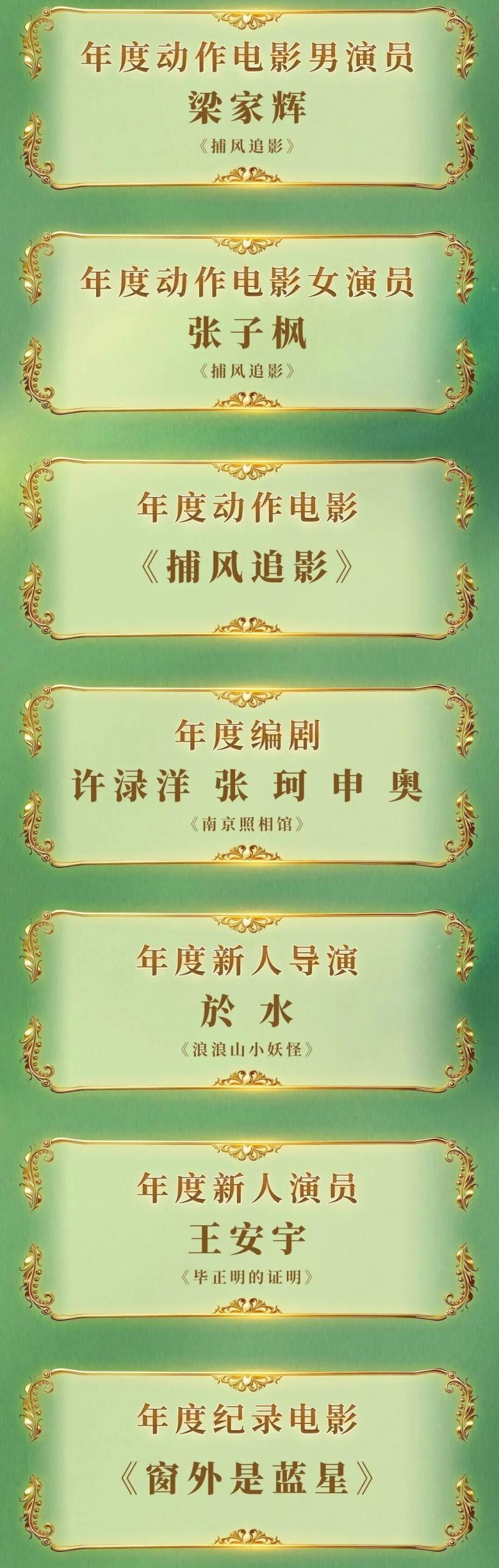 動作電影《捕風追影》榮獲年度動作電影、年度動作電影男演員、年度動作電影女演員三項榮譽。《唐探1900》榮獲年度喜劇電影。《長安的荔枝》主演大鵬在領取年度喜劇電影男演員榮譽時感言:“第一次有一個榮譽鼓勵喜劇創作,從來沒有這么被重視過。”