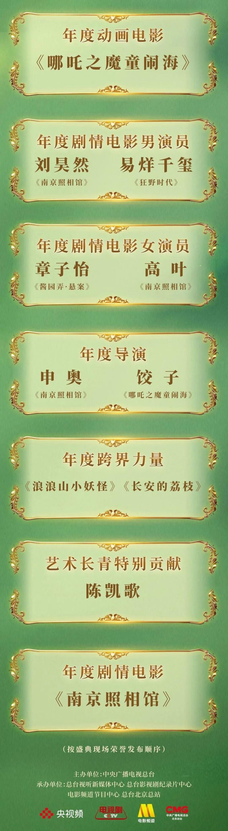 動畫巨制《哪吒之魔童鬧海》榮獲年度動畫電影、年度導演及年度視覺效果三項榮譽。出品人王長田表示,再高的電影票房紀錄都會被打破,只有好的電影才會永遠留在觀眾的心中,無法被取代。