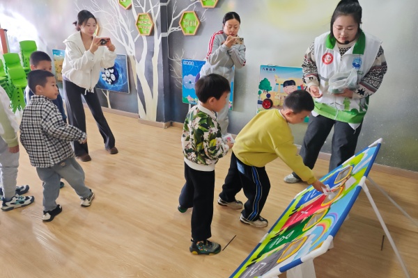 理論學習結束后,最受孩子們期待的趣味游戲環節正式開啟。工作人員精心設計了投擲沙包、垃圾分類大轉盤兩個互動游戲,讓孩子們在玩中學、學中樂,徹底吃透垃圾分類知識。