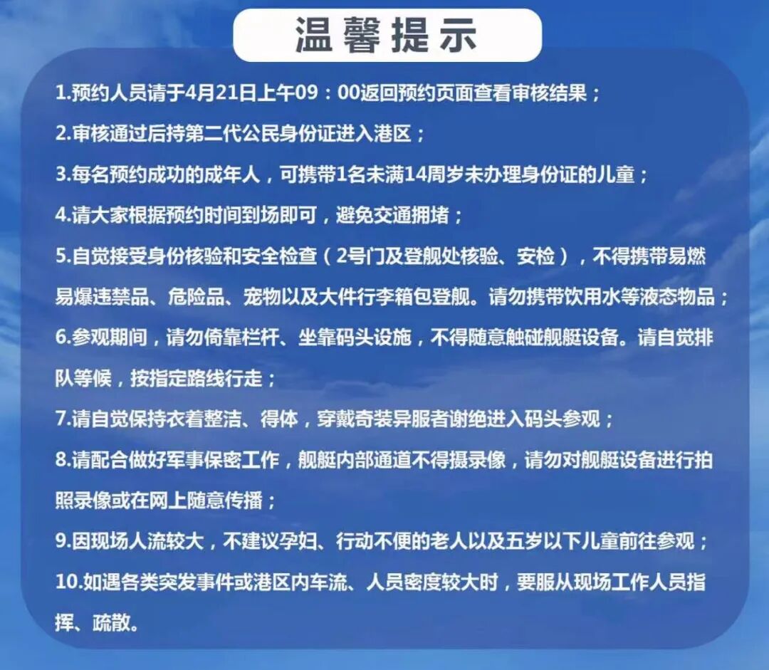 審核通過后,請持身份證原件按預約時間經(jīng)安檢核驗后,登艦參觀。