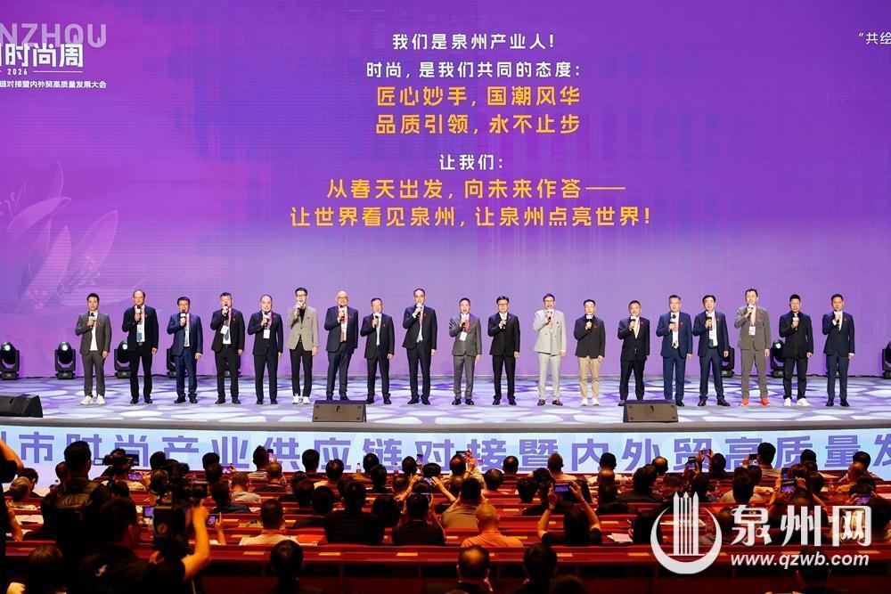 大會最后,20位企業(yè)家代表共同登臺,發(fā)出“共繪藍圖 時尚接力”倡議。大家鄭重承諾,將傳承弘揚“晉江經(jīng)驗”,堅守實業(yè)、深耕主業(yè),敢闖敢試、創(chuàng)新突破,以時尚為引領(lǐng)、以實干顯擔(dān)當(dāng),政企同心、接力奮進,為愛拼敢贏的泉州精神續(xù)寫新的時代榮光。