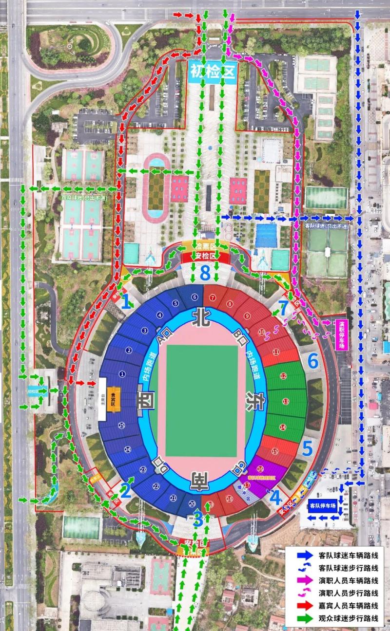 為避免繞行勞累,體育場內場18—25區觀眾請從體育場南入口(文體路)、西入口(天府路)進入,經西南(2號)、正南(3號)臺階檢票入場;內場1—15區觀眾從體育場北口(溫泉路)進入,經西北(1號)、正北(8號)、東北(7號)檢票入場;南區誤入北區的觀眾,請從西側臨時通道到天府路,經天府路西入口繞行進入南區。敬請提前規劃。